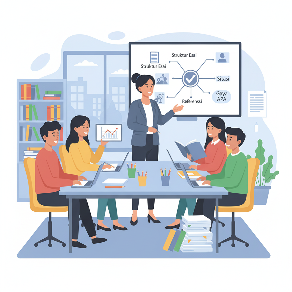 Workshop membahas penggunaan bahasa formal, tata bahasa yang baku, serta format penulisan sesuai standar seperti APA, MLA, atau Chicago. - Penggunaan Referensi dan Sitasi