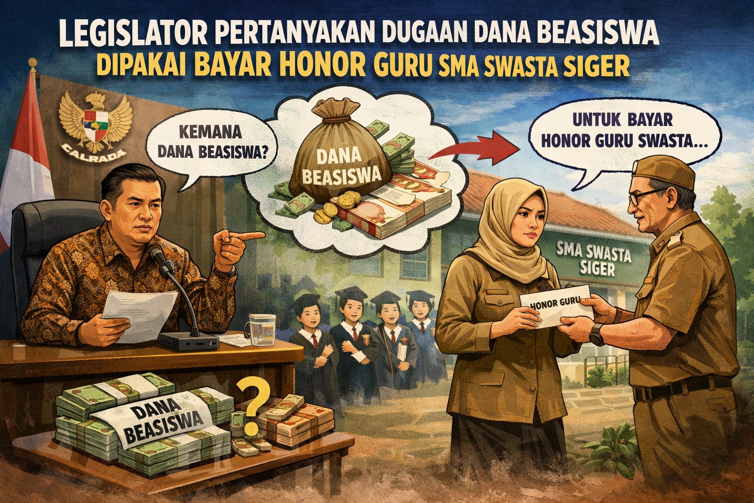 MAJALAH NARASI- Sumber dana pembayaran honorarium tenaga pengajar SMA Swasta Siger Bandar Lampung menuai sorotan tajam. Seorang legislator DPRD secara terbuka mempertanyakan kemungkinan digunakannya anggaran beasiswa untuk membayar honor guru di sekolah swasta tersebut.