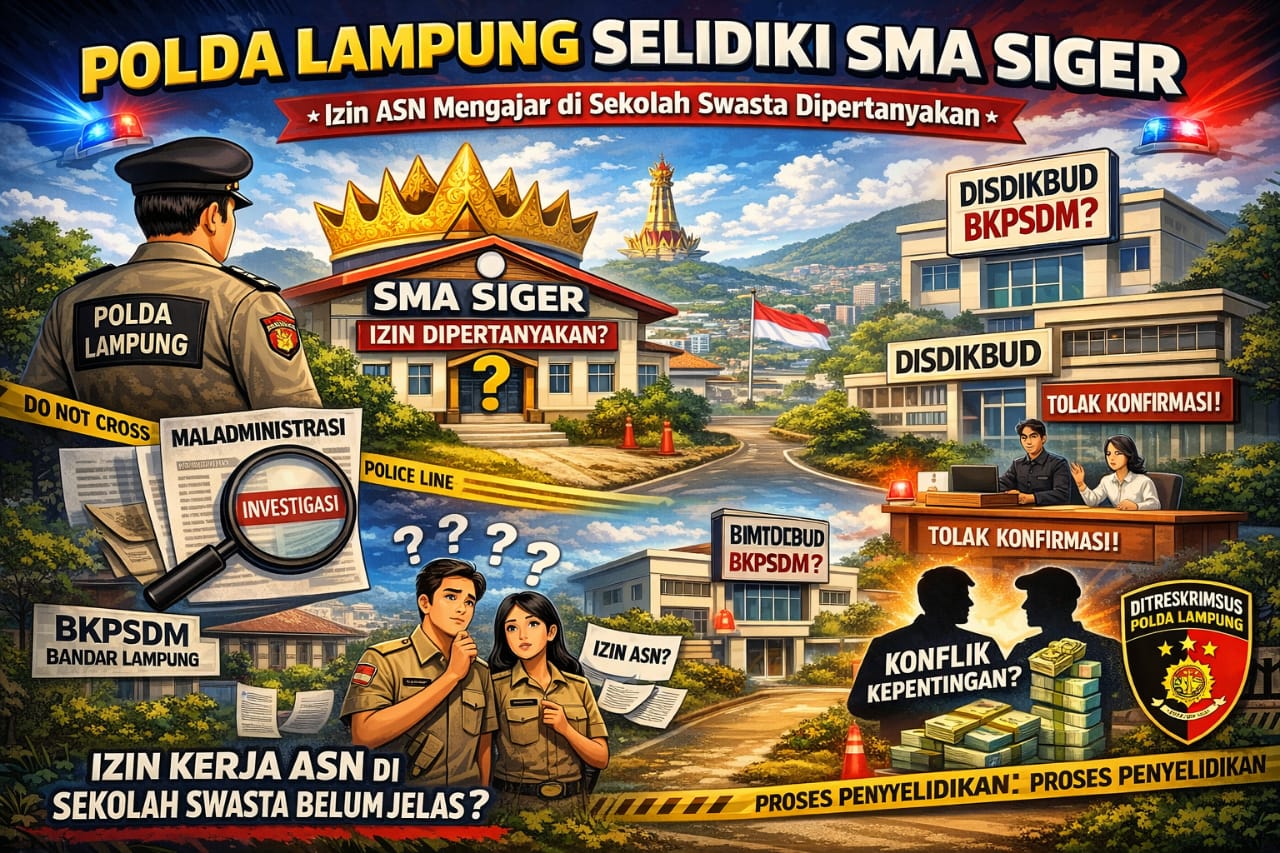 MAJALAH NARASI- Penugasan aparatur sipil negara (ASN) dan pegawai negeri sipil (PNS) untuk mengajar di SMA Swasta Siger Kota Bandar Lampung kini menjadi sorotan serius. Selain memunculkan tanda tanya soal izin kerja dan legalitas administrasi, persoalan ini juga telah masuk tahap penyelidikan oleh Ditreskrimsus Polda Lampung. Minimnya keterbukaan informasi dari Dinas Pendidikan dan Kebudayaan (Disdikbud) Kota Bandar Lampung semakin memperkeruh situasi dan memicu dugaan maladministrasi hingga konflik kepentingan.