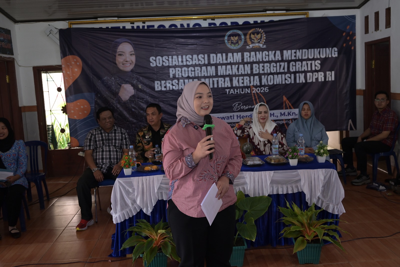 Sosialisasi dipimpin Anggota Komisi IX DPR RI, Rahmawati Herdian, bersama mitra pelaksana Badan Gizi Nasional. Hadir pula Tenaga Ahli DPR RI, Rakhmat Husein Darma Cane, perwakilan KPPG wilayah Lampung–Bengkulu, serta unsur pemerintah setempat.
